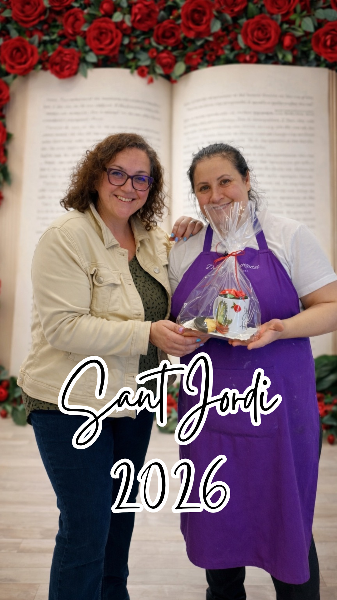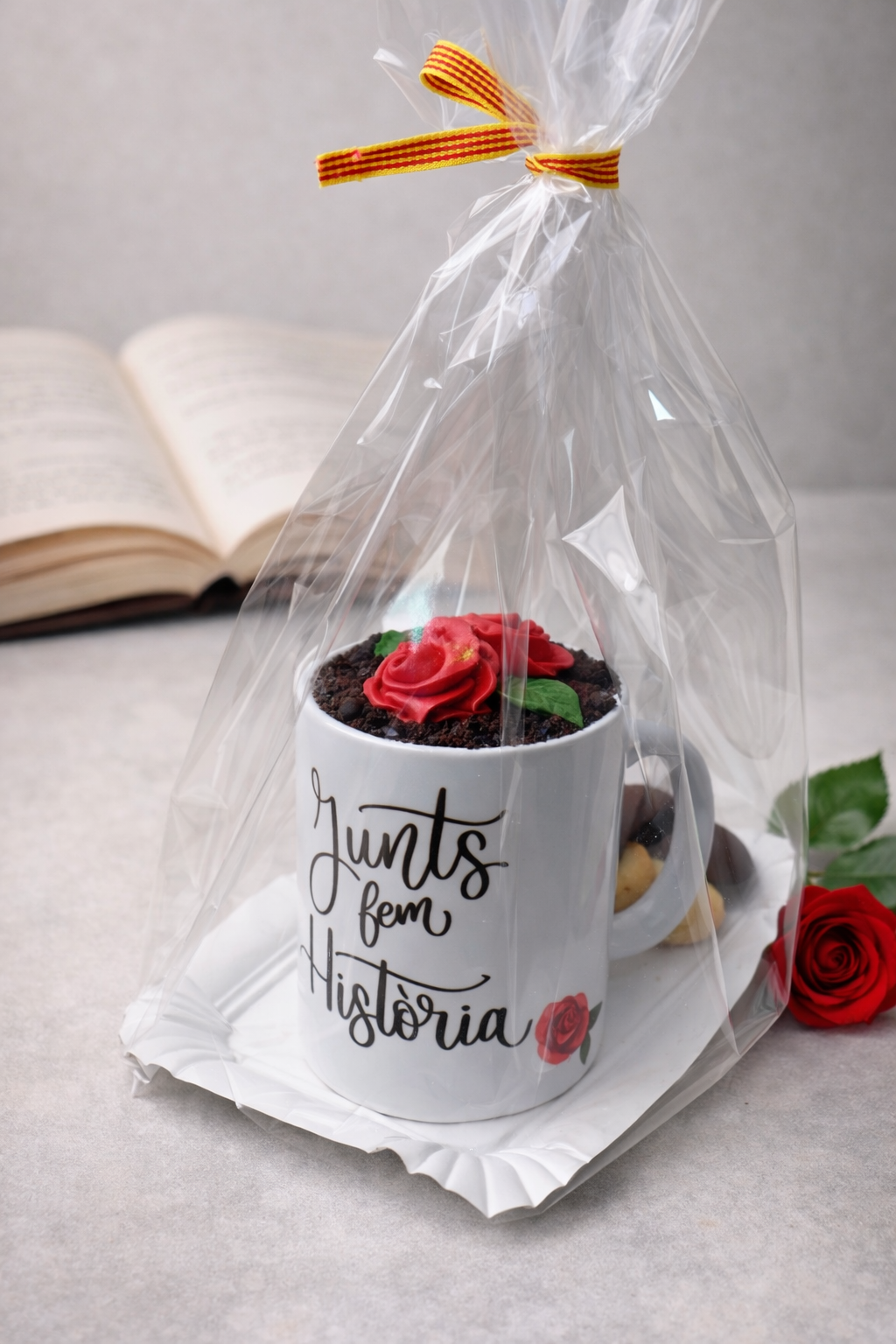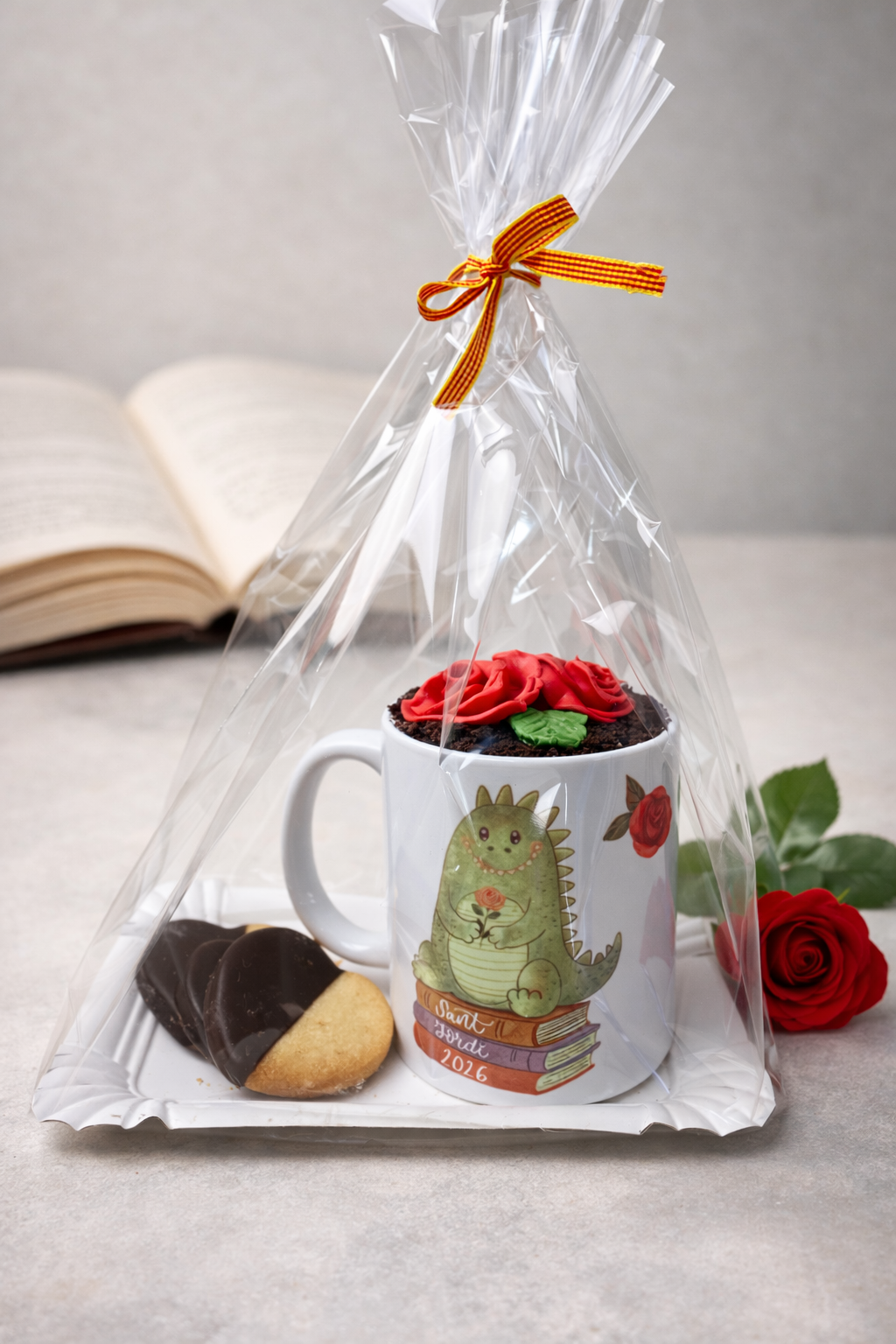Precioso y delicioso Pack de Sant Jordi El compuesto por tres galletitas de mantequilla en forma de corazón, un pastelito riquísimo dentro de una taza con diseño de Sant Jordi.